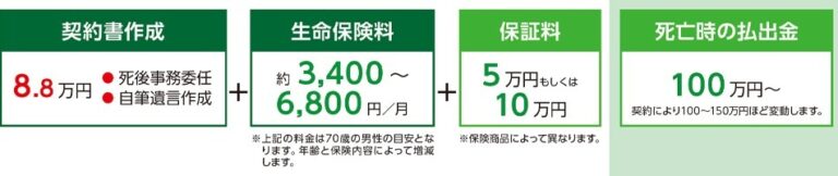 - 保険契約日より規定年数経過後に死亡した場合は、支払事由に該当し生命保険金として100万円~が支払われます。保険金は契約内容によって異なります。万が一、責任開始日より規定年数経過する前に死亡した場合には、既払込保険料相当額が給付されます。規定年数経過する前に死亡した場合、死後事務に必要な費用を満たせない場合があるため、申込時に保証料5万円もしくは10万円をお支払いいただき、死後事務費用が補填される制度を採用しております。